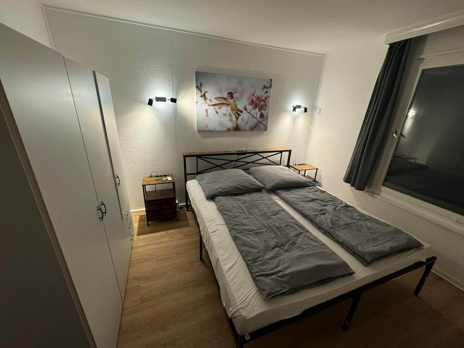 Schlafzimmer mit King-Size Doppelbett mit LED-Beleuchtung und Stromleiste